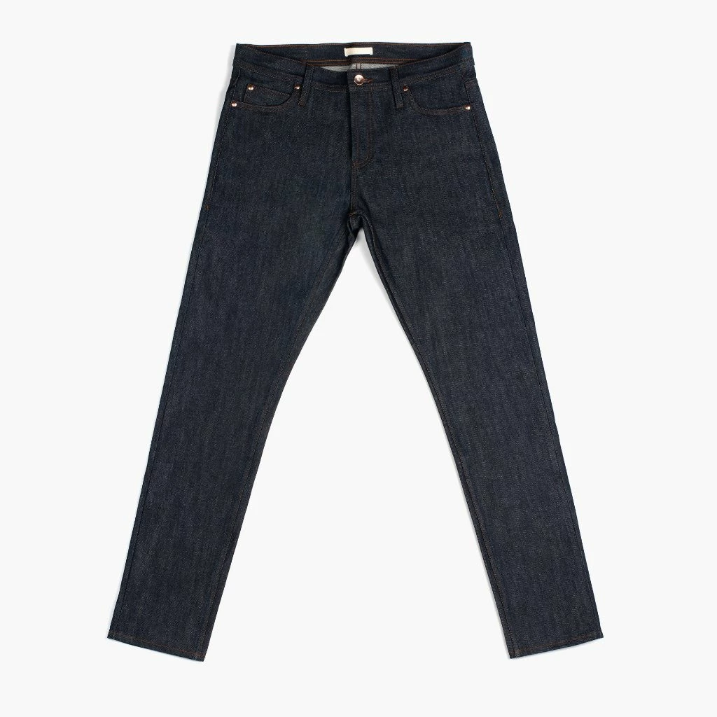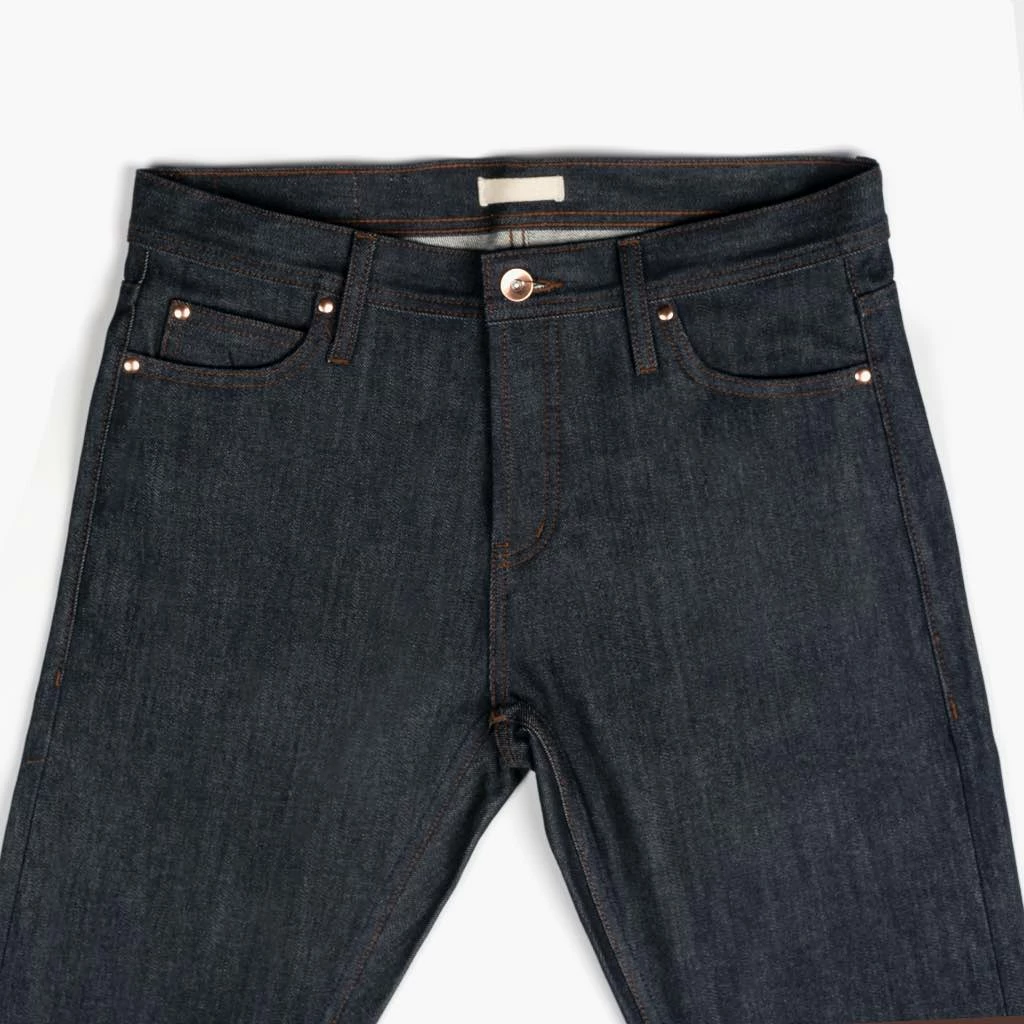 - Five-Pocket Style with Copper Tin Button Fly